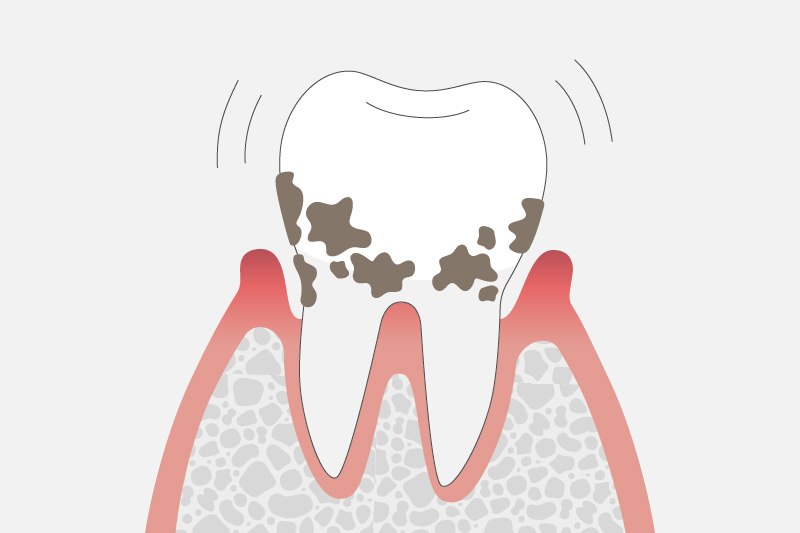 見た目としては歯が大きく揺れたり、歯ぐきから膿が出ることがあります。痛みは強くなる場合もあり、日常生活では食事が困難になることもあります。症状の進行によっては、抜歯が必要となるケースもあります。