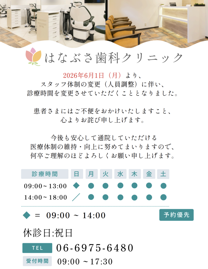 2026年6月から午後の診療時間が下記の通り変更になります。